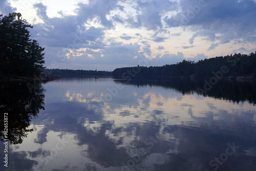 © Gregory, Fototapeta premium Man canoeing on a northern Ontario lake in the evening with clouds and forest reflecting in the water