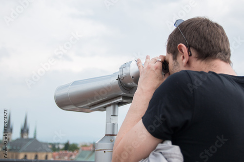 © dtatiana, Obraz premium man carefully looking through binoculars