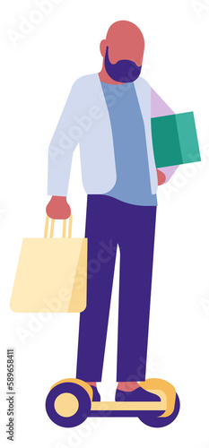 © VectorBum, Obraz premium Man carrying shopping bags on gyroscooter. Guy riding electric transport
