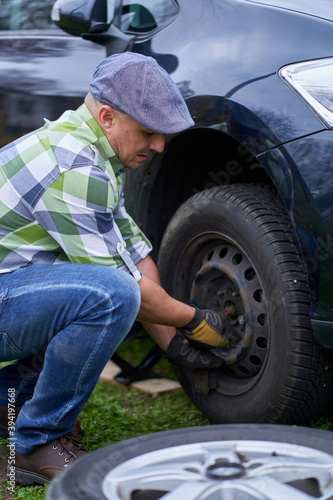 Fototapeta premium Man changing a flat tyre
