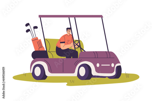 © Happypictures, Fototapeta premium Man Character Golf Playing Ride Car with Golf Clubs on Green Grass Vector Illustration