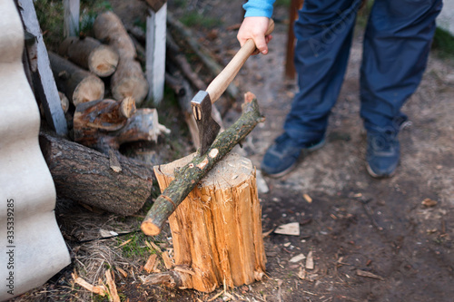 Obraz premium Man chopping wood in the backyard. Lumberjack cuts logs