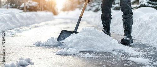 Fototapeta premium Man clears snow from pathway in winter morning sunlight while wearing boots...