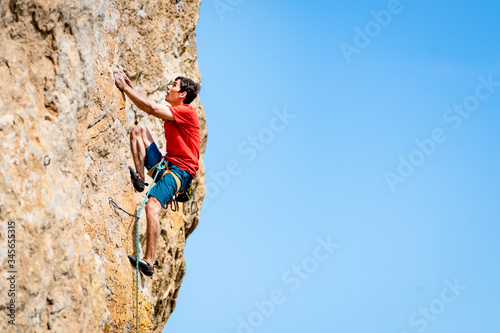 © Александра Голубцова, Fototapeta premium Man climbs a rock.