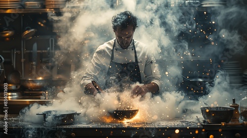 © MIKHAIL, Obraz premium Man Cooking Amid Smoke