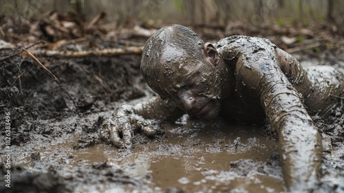 Fototapeta premium Man covered in mud crawling through a muddy forest area.