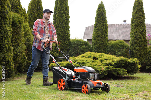Fototapeta premium Man cutting green grass with lawn mower in garden