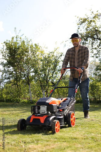 Fototapeta premium Man cutting green grass with lawn mower in garden