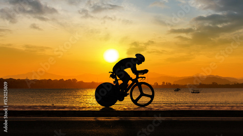© taitai6769, Fototapeta premium Man cycling at beach evening time