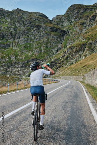 Fototapeta premium Man cyclist in cycling kit and a helmet is drinking water from a sports...