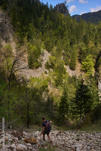 Fototapeta premium Man descending forested mountain ravine