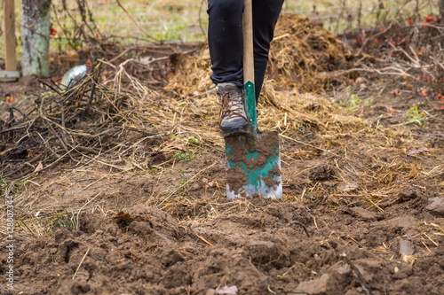 Fototapeta premium Man digging with spade in garden