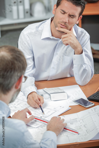 © auremar, Fototapeta premium Man discussing blueprints, frowning