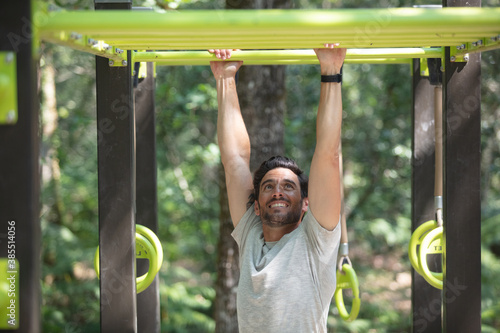 Obraz premium man doing abdominal exercise on horizontal bar in summer park