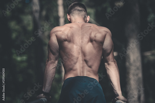 Fototapeta premium man doing exercises in outdoor gym naked torso.