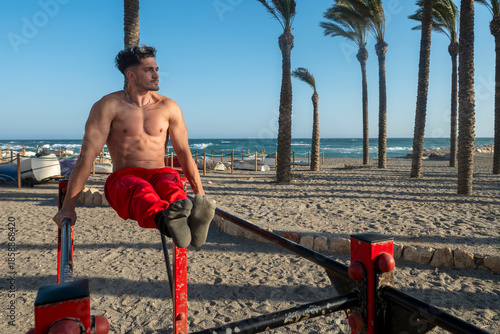 Fototapeta premium Man doing l sit calisthenics workout on beach bars