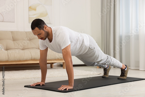 © New Africa, Naklejka premium Man doing morning exercise on fitness mat at home