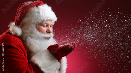 Naklejka premium Man dressed as Santa Claus blowing snow from his hands against a vibrant red background.