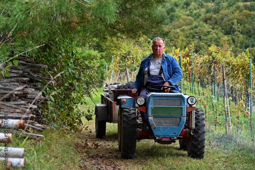 © Vedrana, Obraz premium Man driving tractor with trailer in vineyard