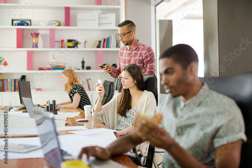 © KOTO, Obraz premium Man eating and working at conference tablet