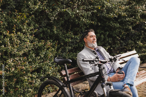 © milanmarkovic78, Fototapeta premium Man Enjoying Break on Park Bench
