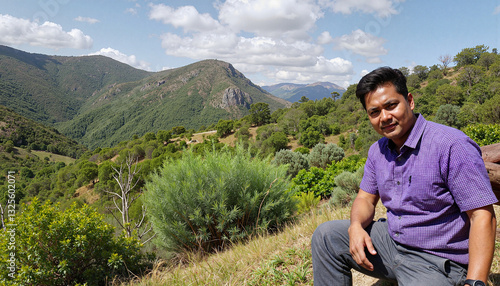 © Elenba, Naklejka premium Man enjoying nature in serene mountainous landscape