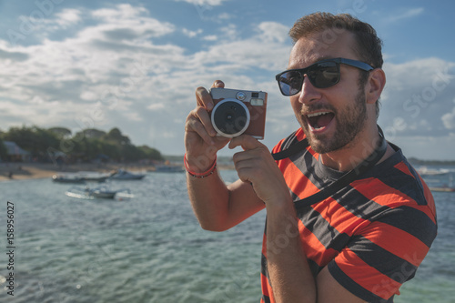 Obraz premium Man enjoying summer with his retro camera on the sea / ocean.