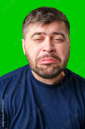 © fotofabrika, Fototapeta premium Man expressing confusion with crossed arms in front of a bright green background
