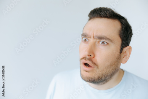 © Alexandr, Fototapeta premium Man expressing surprise in a minimalist indoor environment during daytime