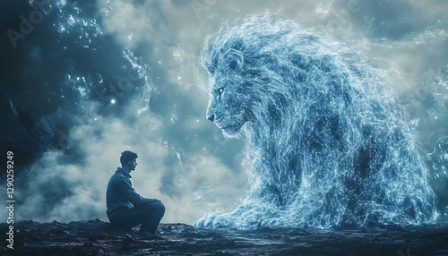 © Bagas, Obraz premium Man facing ice lion, fantasy landscape