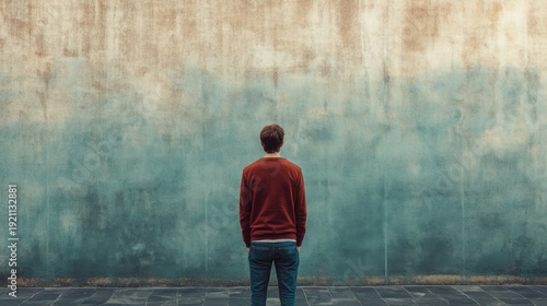 Fototapeta premium Man facing large textured wall, contemplating