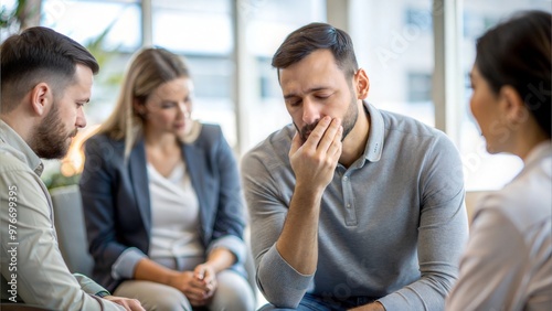 © N7, Obraz premium Man Feeling Overwhelmed in Support Circle - A man looking overwhelmed in a support circle.