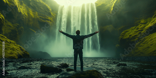 © Andres Mejia, Obraz premium Man feeling small enjoying epic waterfall in iceland