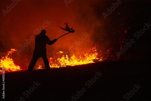 © Vladyslav , Obraz premium Man fights wildfire at night using improvised tools