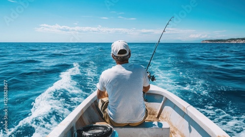 © SlashStd, Naklejka premium Man fishing on boat, ocean background, sunny day, summer travel