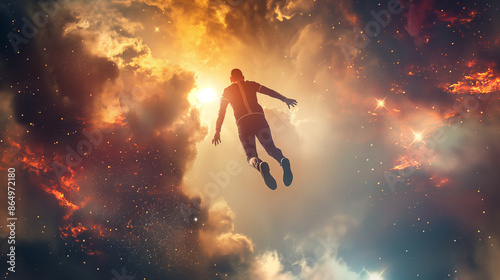 Naklejka premium Man flying through cosmic nebula. Visiting other dimensions and realms. Lucid...