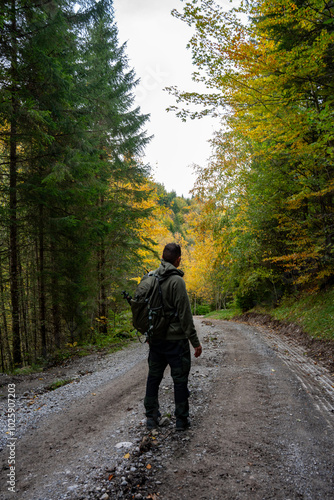 Fototapeta premium Man, forest, Trail, path, road, autumn, hike, hiking
