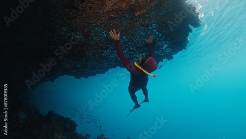 © Dudarev Mikhail, Naklejka premium Man freedives underwater in the tropical sea in Raja Ampat in Indonesia