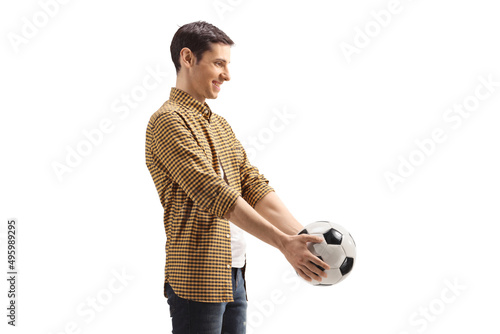 © Ljupco Smokovski, Fototapeta premium Man giving a soccer ball and smiling