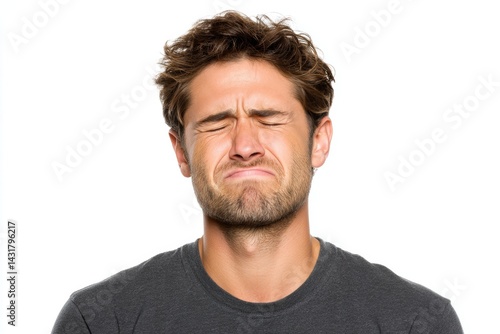 Obraz premium Man grimacing in pain with squinted eyes against plain white background