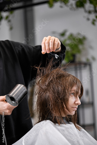 Naklejka premium man hairdresser dries female hair with hairdryer after washing