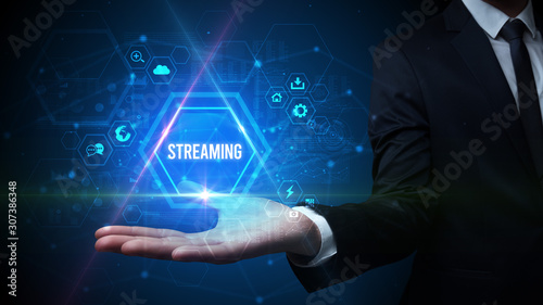 © ra2 studio, Naklejka premium Man hand holding STREAMING inscription, social media concept