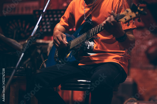 © Charnchai saeheng, Obraz premium man hand playing guitar acoustic and singing on the stage at night.