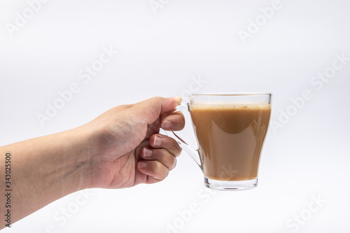 © alenthien, Fototapeta premium Man hand with A glass of Coffee on White Background.