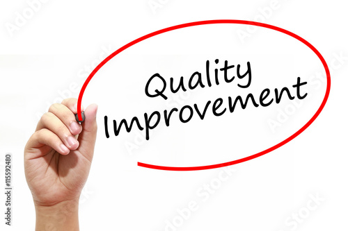 Fototapeta premium Man Hand writing Quality Improvement with marker on transparent wipe board. Business, internet, technology concept.