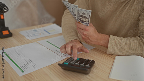 Obraz premium Man hands counting at home desk display young hispanic boxes containing cash near calculator and bills.