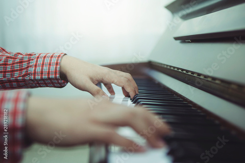 © isara, Fototapeta premium man hands is playing on piano keys with window light, Close up