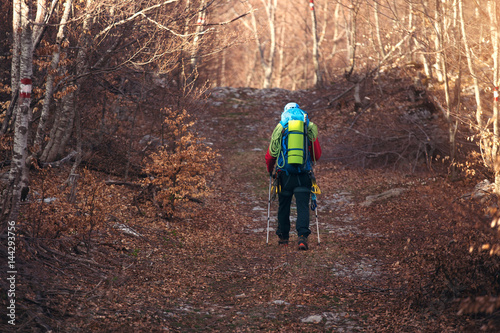 © Mediteraneo, Obraz premium Man hiking descend to the mountain, autumn
