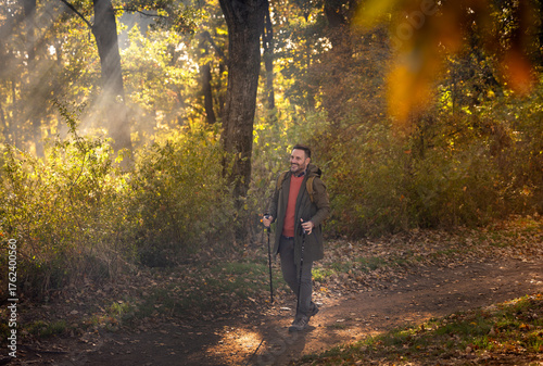Fototapeta premium Man hiking through colorful autumn forest