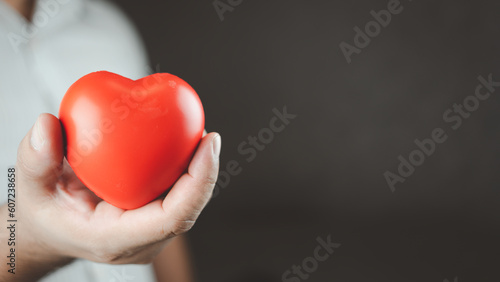 © Dontree, Fototapeta premium Man holding a red heart shape while standing with black background in the studio. Space for text. Donate, love, and encouragement concept